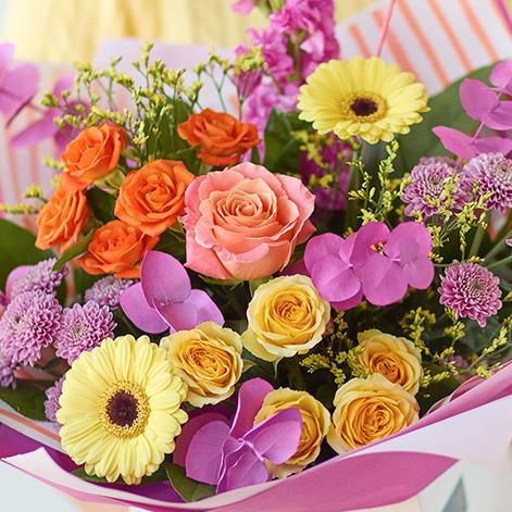A bouquet of fresh, bright flowers – but no lilies – expertly arranged by a local florist.